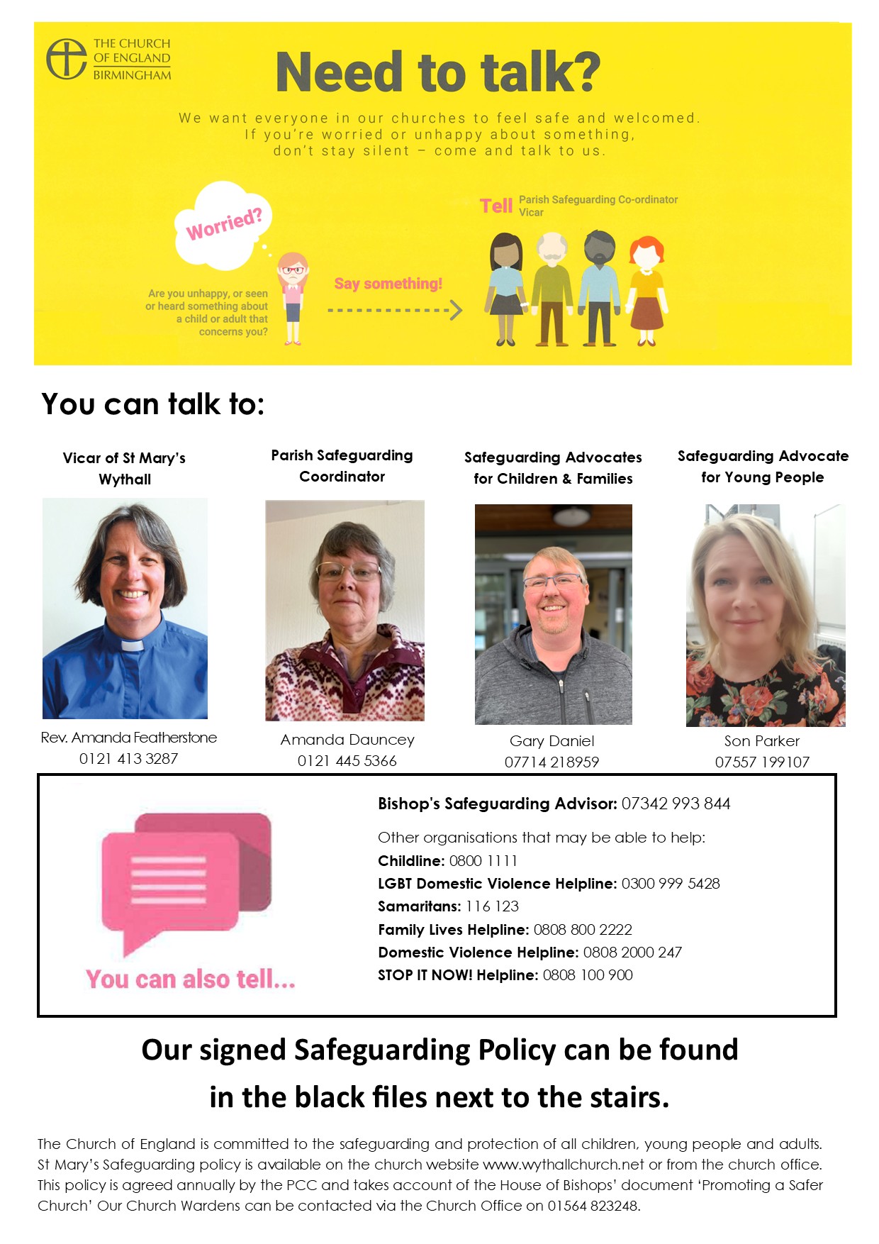 If you want to report a safeguarding concern or just you want to talk about a safeguarding issue, you can contact Amanda Dauncey, Safeguarding Officer for St Mary’s Wythall, on 0121 445 5966.